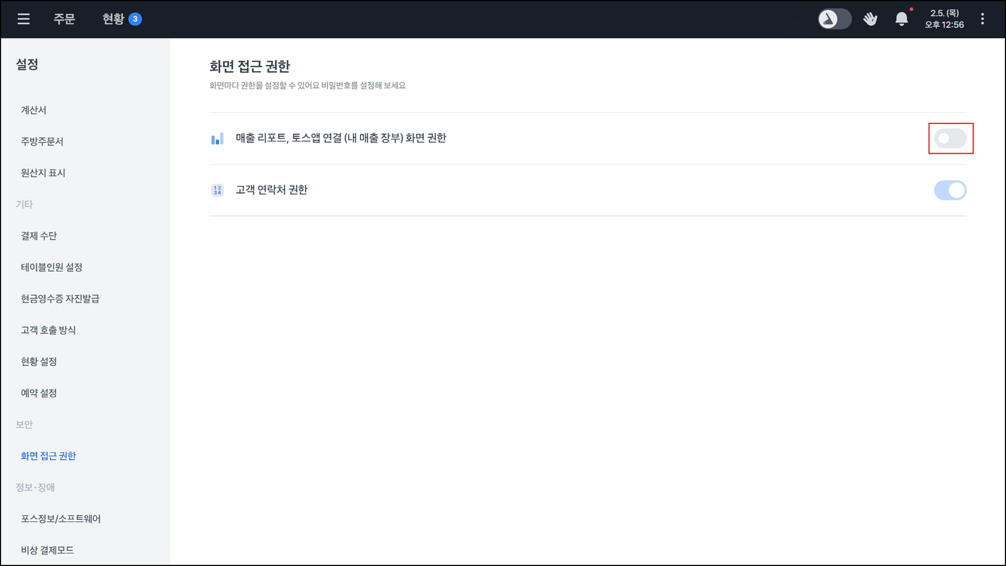매출리포트, 토스앱 연결 (내 매출 장부) 화면 권한의 버튼을 눌러, 켜주세요.