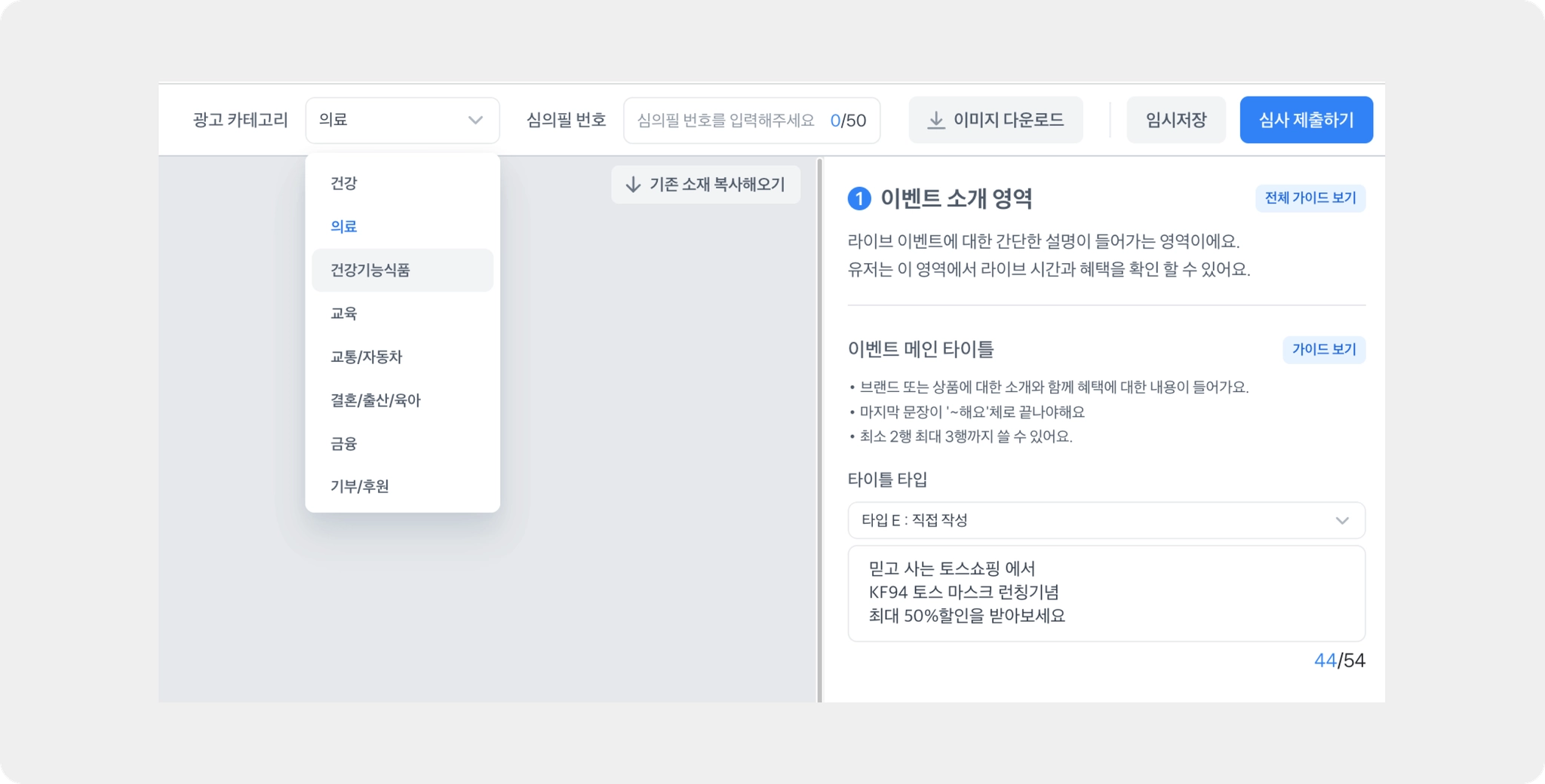 심의필 제출이 필수인 5개 카테고리 선택 시, 심의필 번호 란이 활성화됩니다.