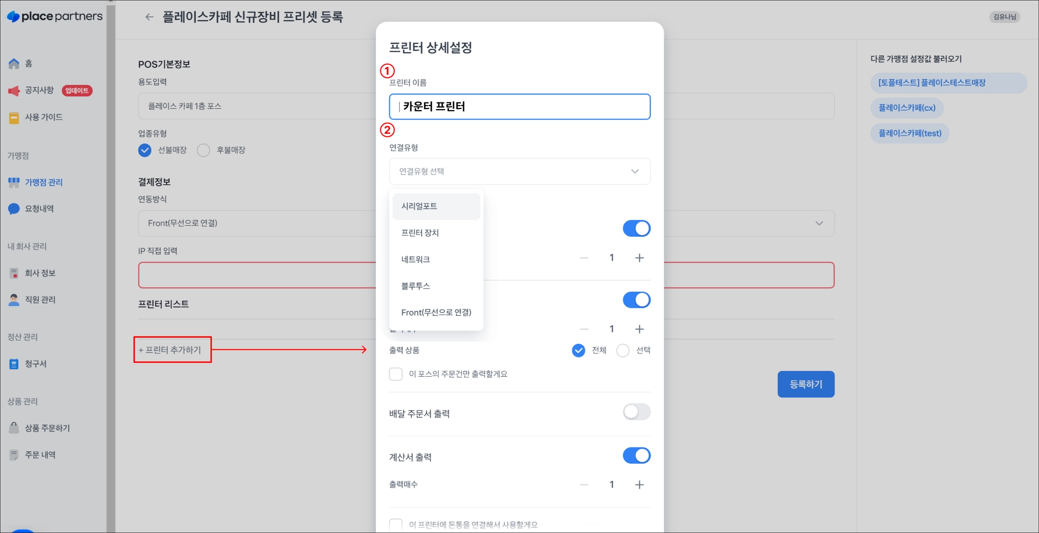 매장에 프린터가 여러대라면 각각 리스트 추가를 해주세요.