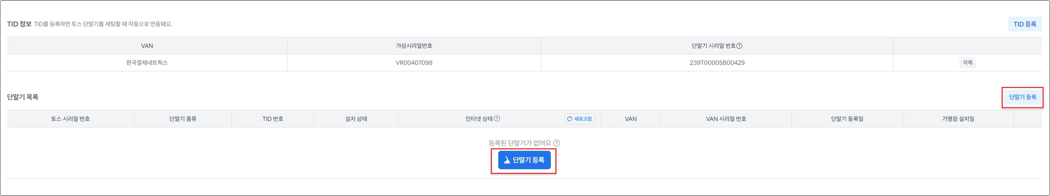 - 한 매장에 두 대 이상의 토스 단말기가 설치될 경우, 밴 개시거래 기준으로 반드시 TID를 각각 발급받아 사용해주세요.