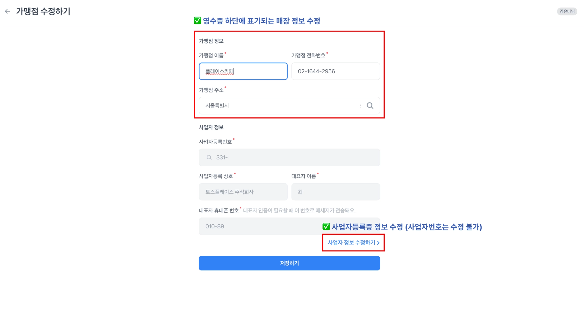 하단 사업자 정보를 수정하고 싶다면 사업자 정보 수정하기를 눌러 수정할 수 있어요.