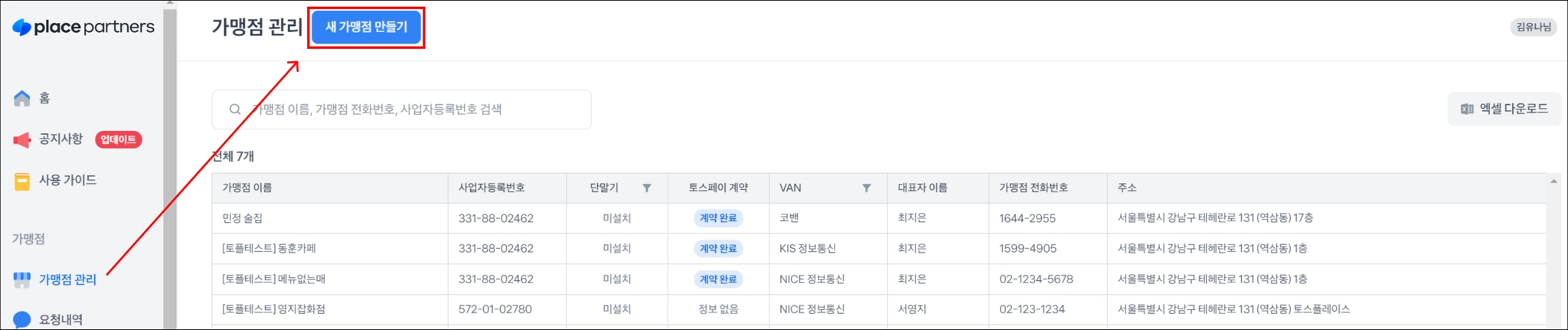 왼쪽 메뉴 가맹점 관리 → 새 가맹점 만들기 를 클릭해주세요.