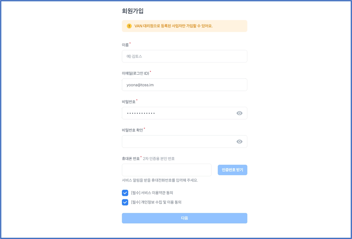 가입자 정보를 입력하고, 필수 동의 후 다음 버튼을 눌러주세요.