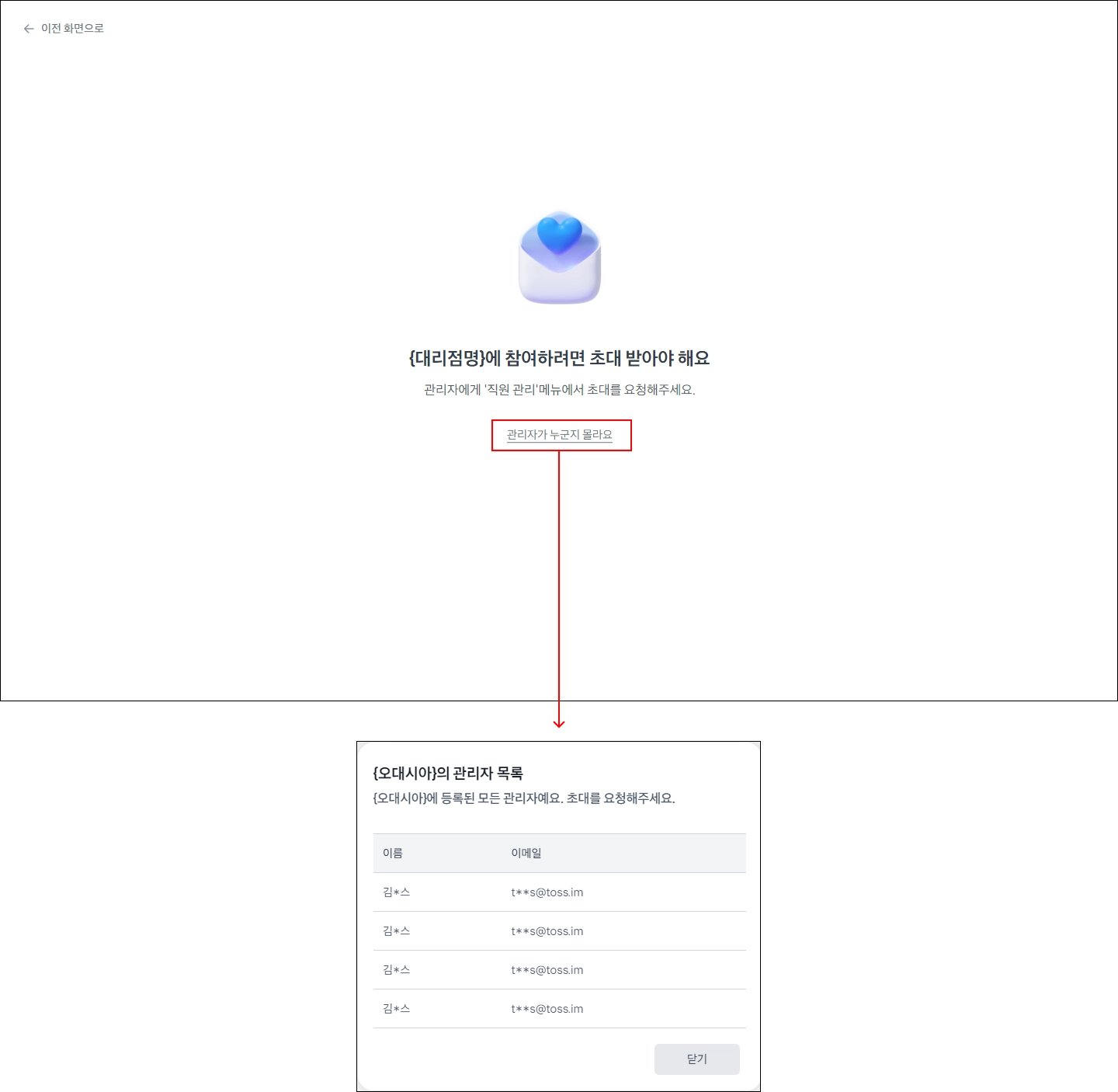 관리자가 누군지 모른다면 아래 [관리자가 누군지 몰라요]를 눌러 확인 후 초대를 요청해주세요.