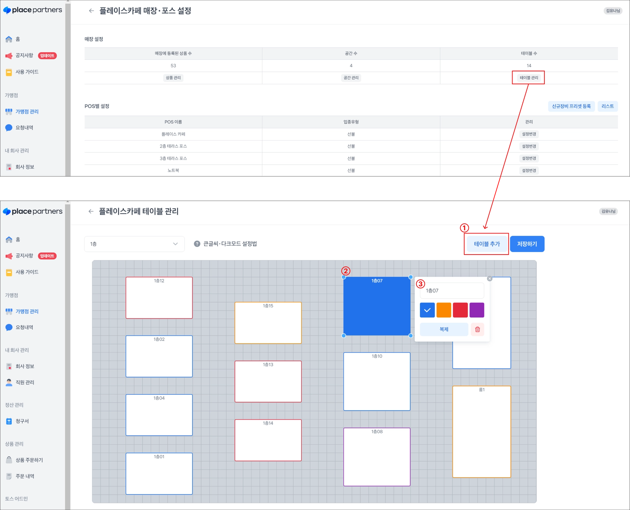 테이블 관리를 누르고, 테이블 추가 버튼을 눌러 테이블을 생성해주세요.