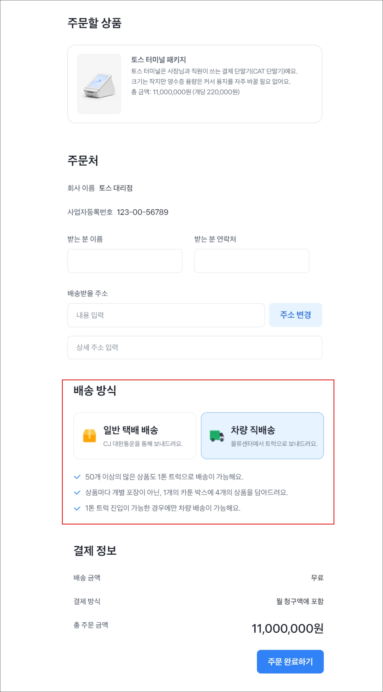 수량 50개 이상부터는 일반 택배 배송과 차량 직배송 중 한 가지를 선택할 수 있어요.