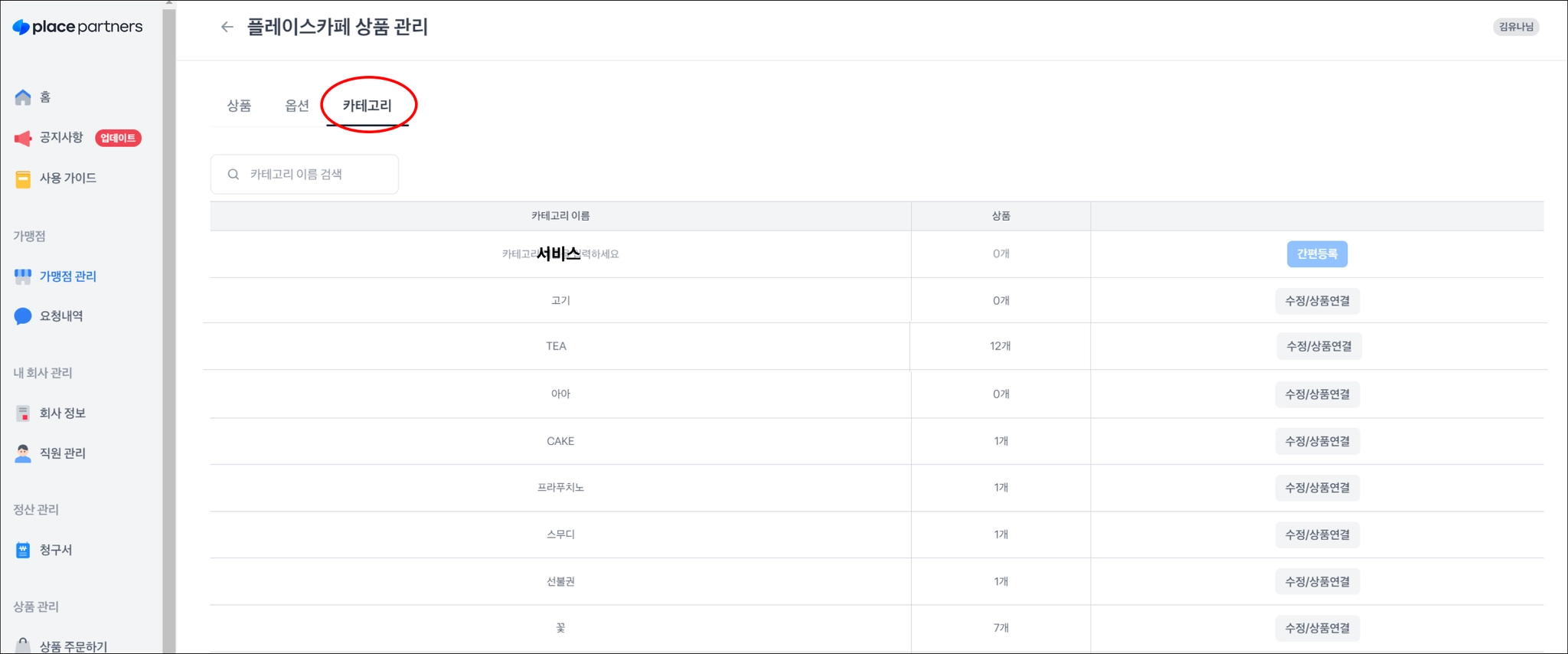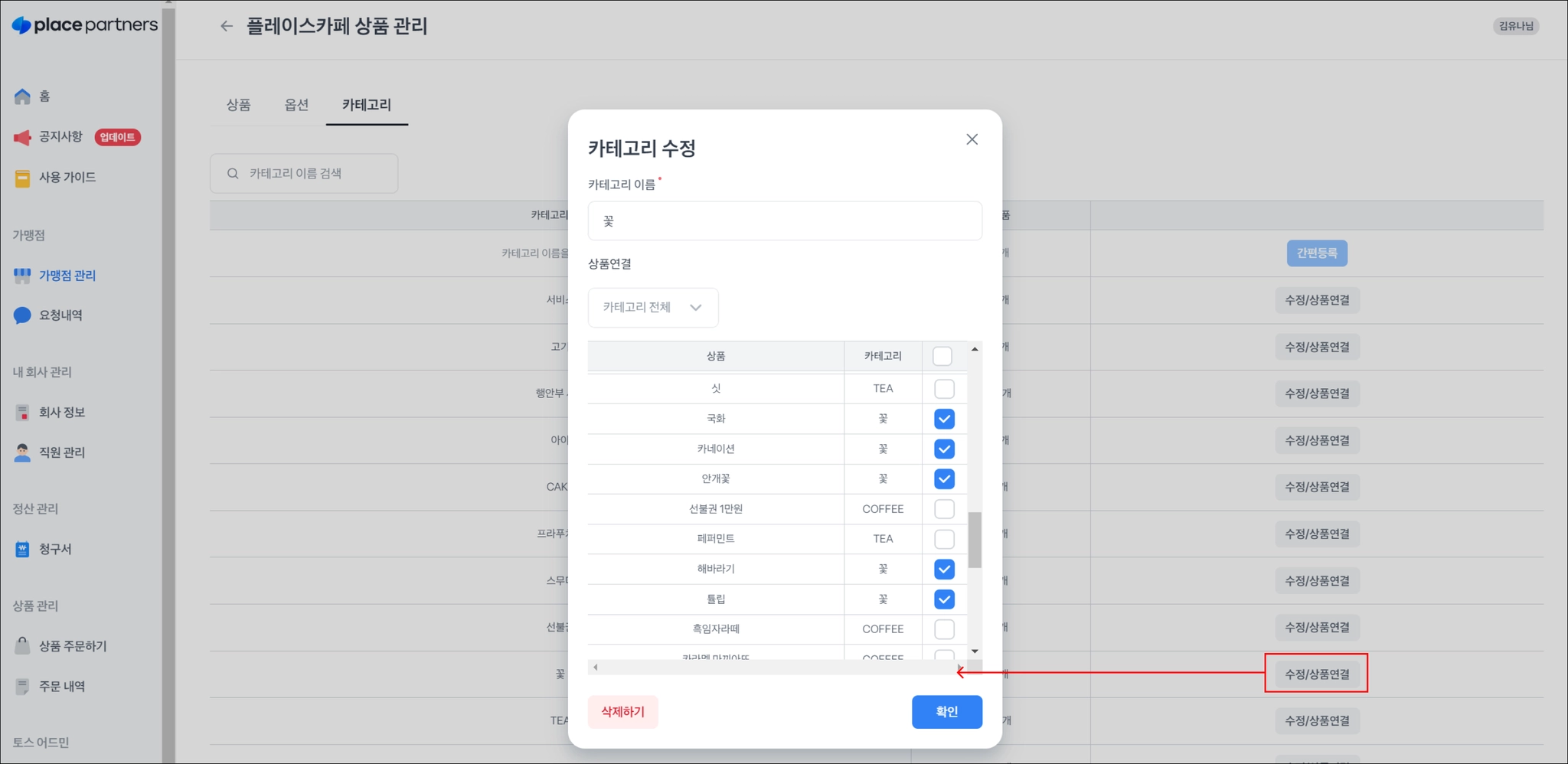 카테고리 수정/상품연결을 눌러 카테고리에 넣을 상품을 체크해주세요.