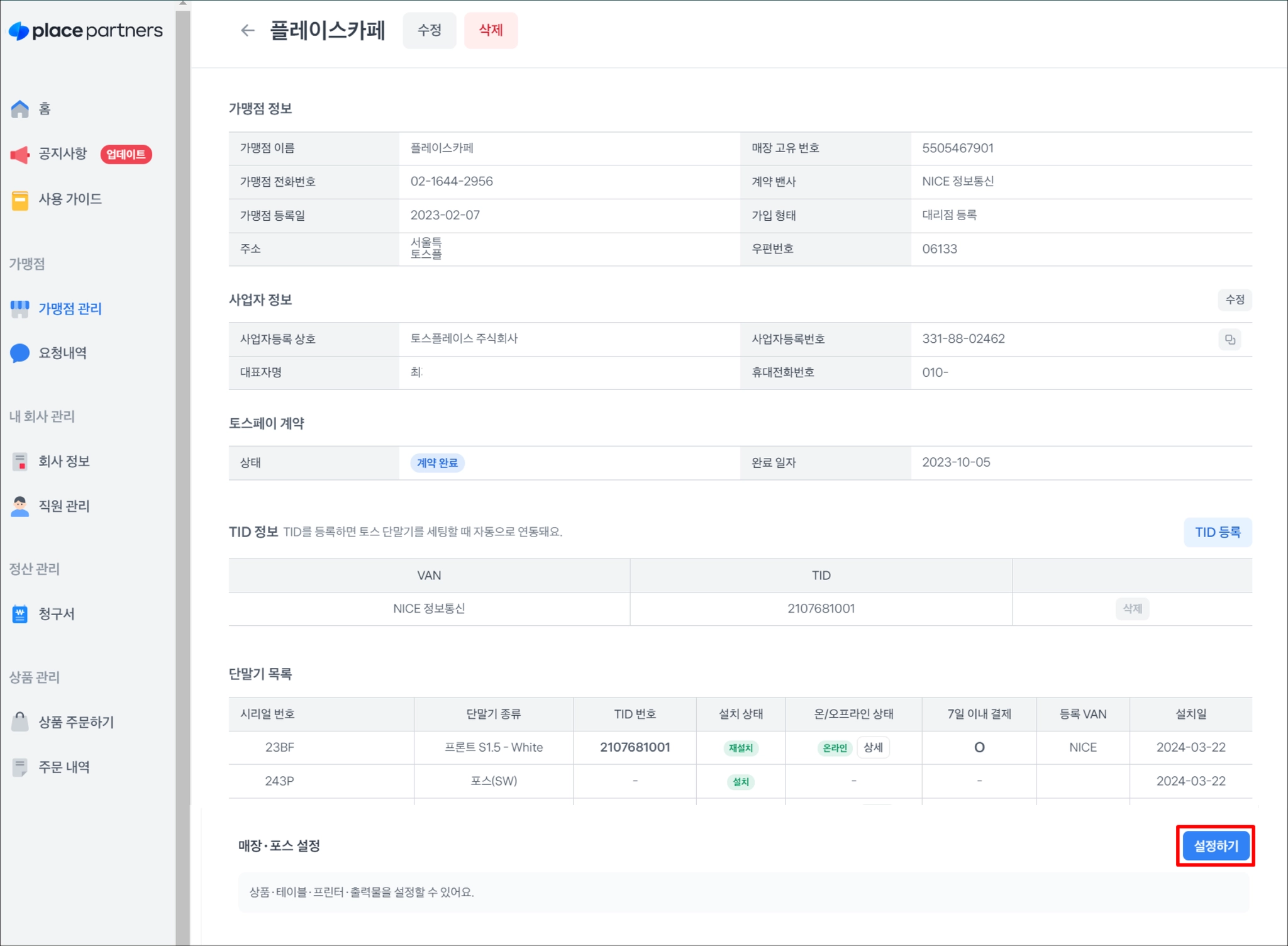가맹점 정보 화면의 아래쪽 ‘매장 · 포스 설정’에서 설정하기를 눌러주세요.