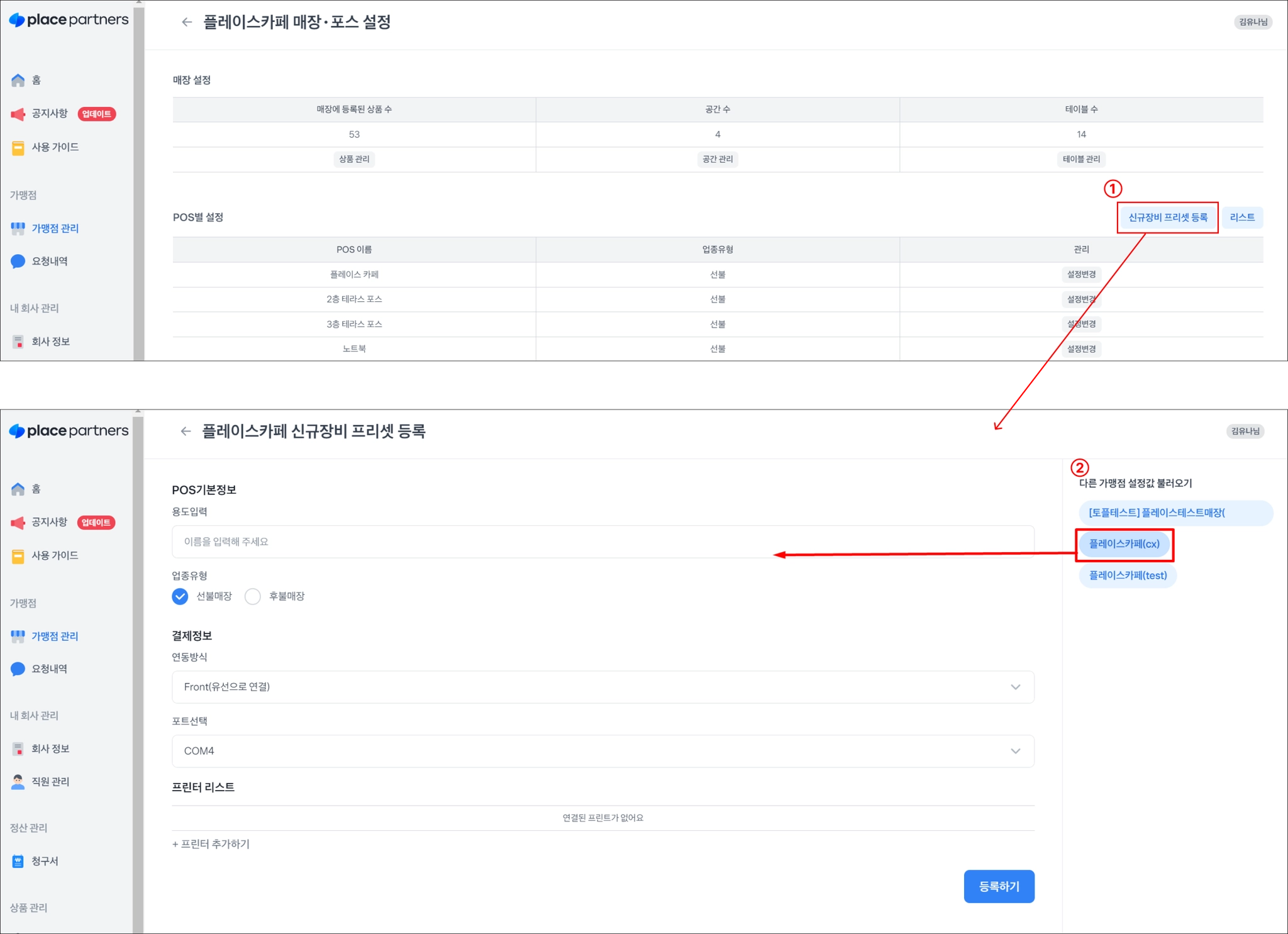 ‘신규장비 프리셋 등록’을 누르면 설정이 가능하고, 오른쪽 [다른 가맹점 설정값 불러오기] 를 누르면 다른 가맹점의 설정값을 그대로 불러와 간편한 설정을 할 수 있어요.
