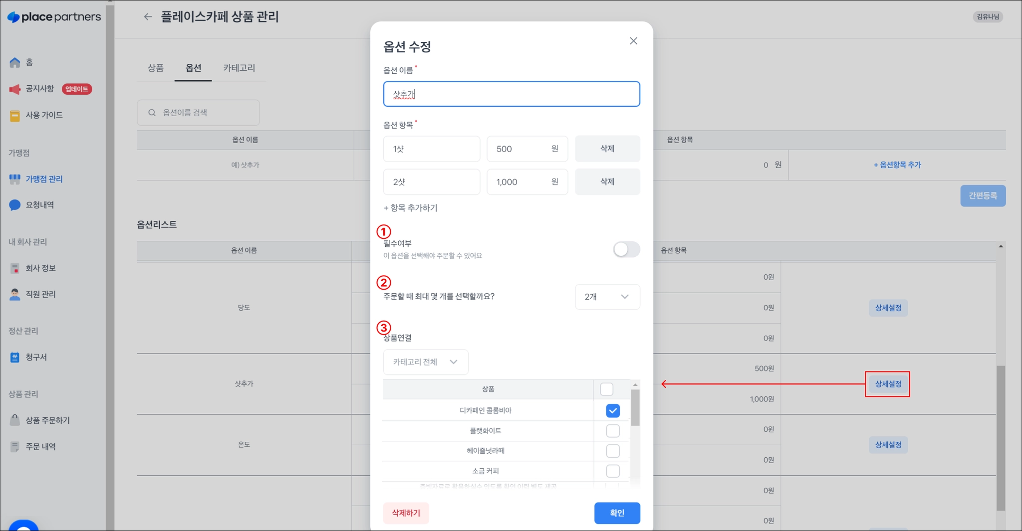 등록한 옵션의 상세설정을 누르면 상세한 항목을 설정할 수 있어요.