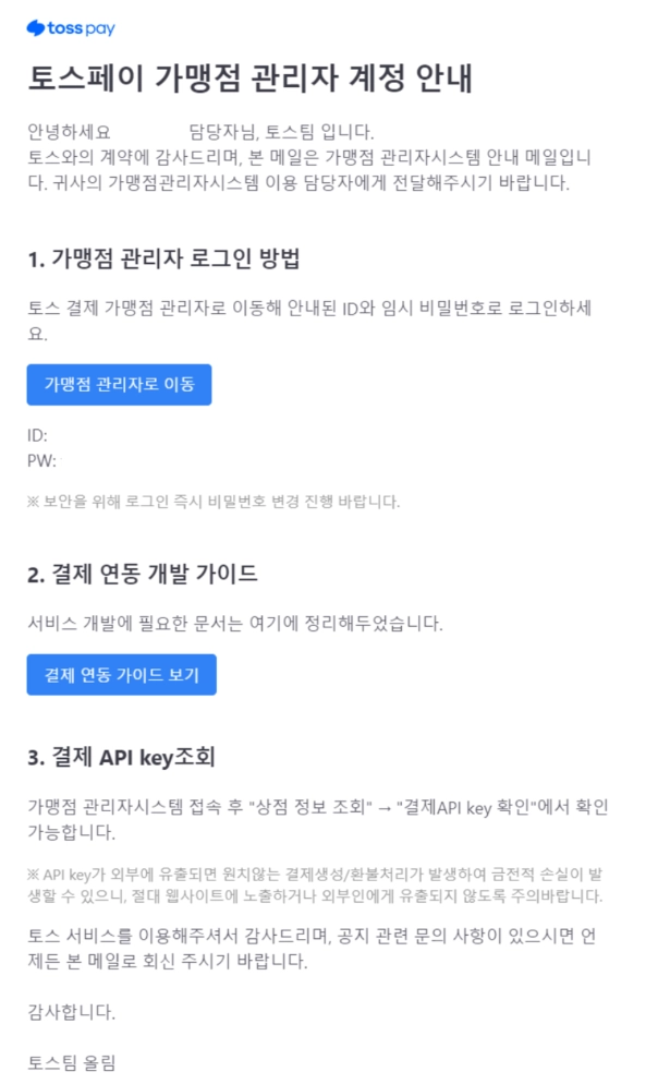 메일 내 ID와 PW를 확인 후 가맹점 관리자 어드민에 접속해 상점키를 확인해 주세요.