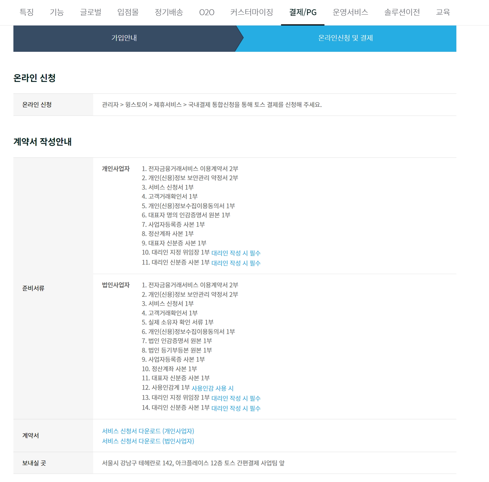 경로 : 위사 로그인 → 솔루션 → 결제/PG → 하단 상세 안내에서 토스 클릭 → 계약서 작성 안내 → 계약서 → 서비스 신청서 다운로드 클릭