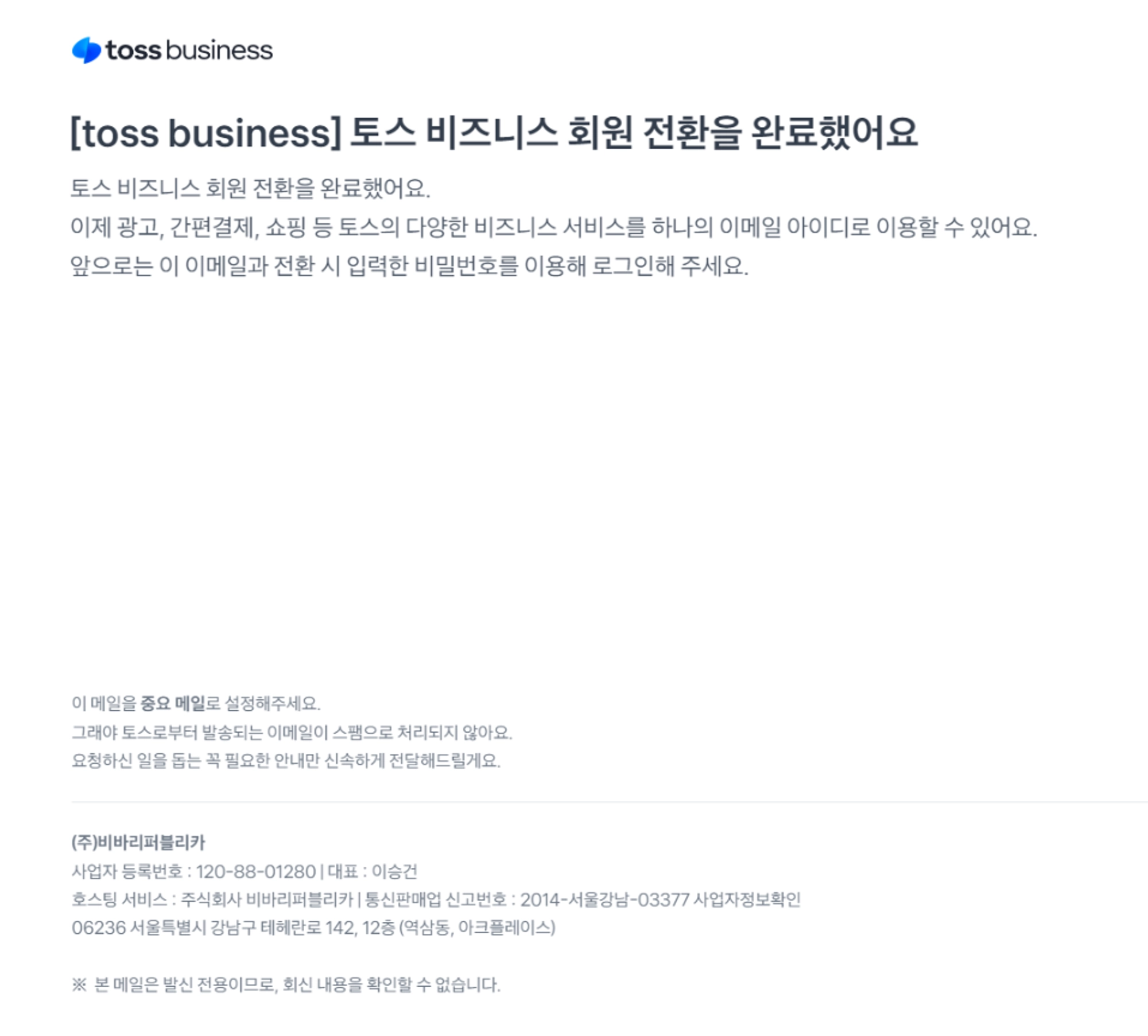 아래와 같이 토스 비즈니스 회원 전환 완료 메일을 보내드려요