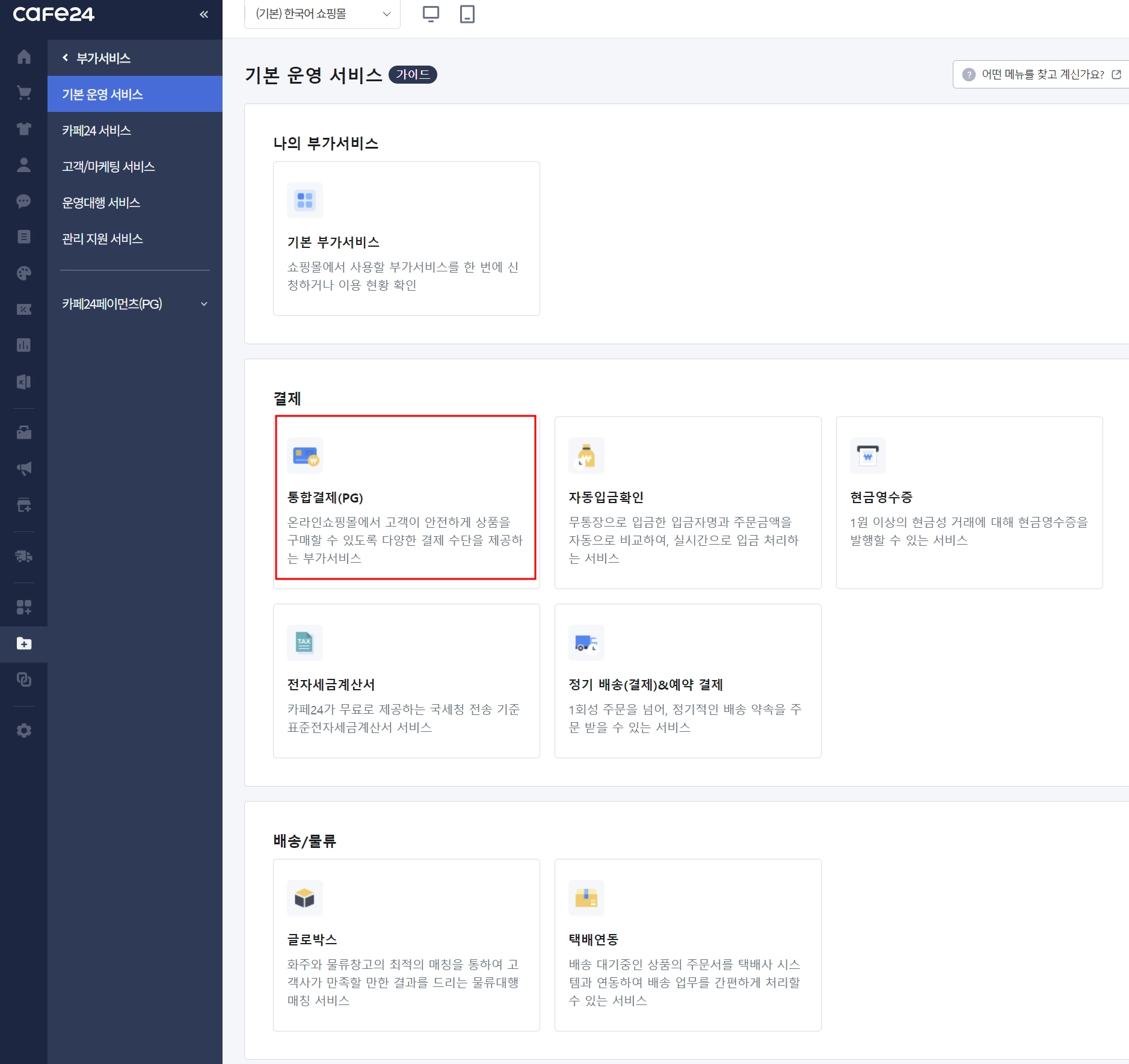 ๊ฒฝ๋ก : ์นดํ24 ๋ก๊ทธ์ธ โ ๋ถ๊ฐ์๋น์ค โ ๊ธฐ๋ณธ ์ด์ ์๋น์ค โ ํตํฉ๊ฒฐ์ (PG)
